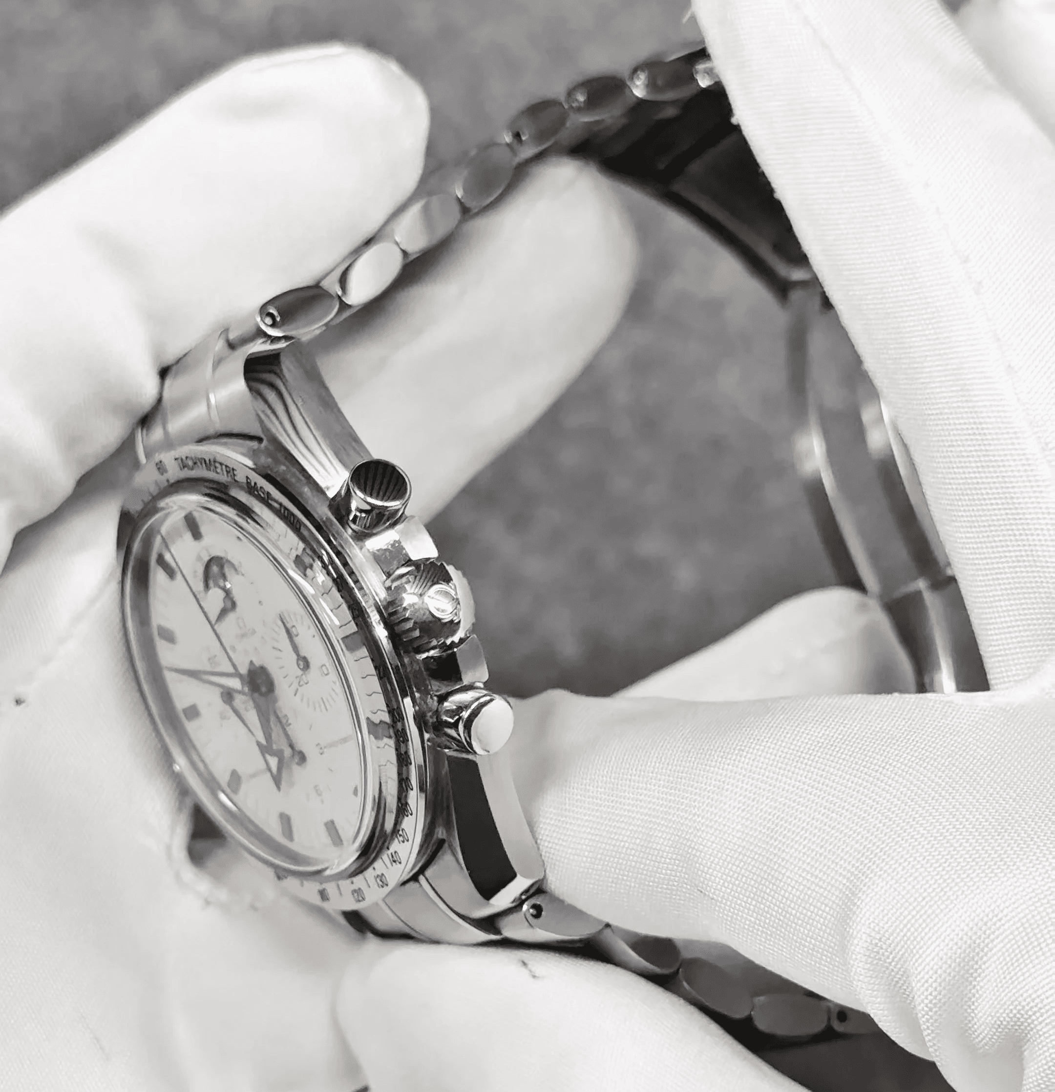 The Omega Speedmaster Professional Moonphase 3575.20 takes the Moonwatch formula and adds poetry to it. The silver dial feels bright and architectural, contrasted by deep blue subdials and a moonphase aperture that pulls your eye inward — a reminder that the Speedmaster’s story was always written in the sky. At 42mm, the classic twisted-lug case and tachymeter bezel remain unmistakable, but the added calendar and moonphase complication give it depth beyond the standard Professional. Powered by a hand-wound chronograph movement, it keeps that direct mechanical connection while offering something rarer, more expressive. Familiar at first glance, captivating on second. Curated with intent.